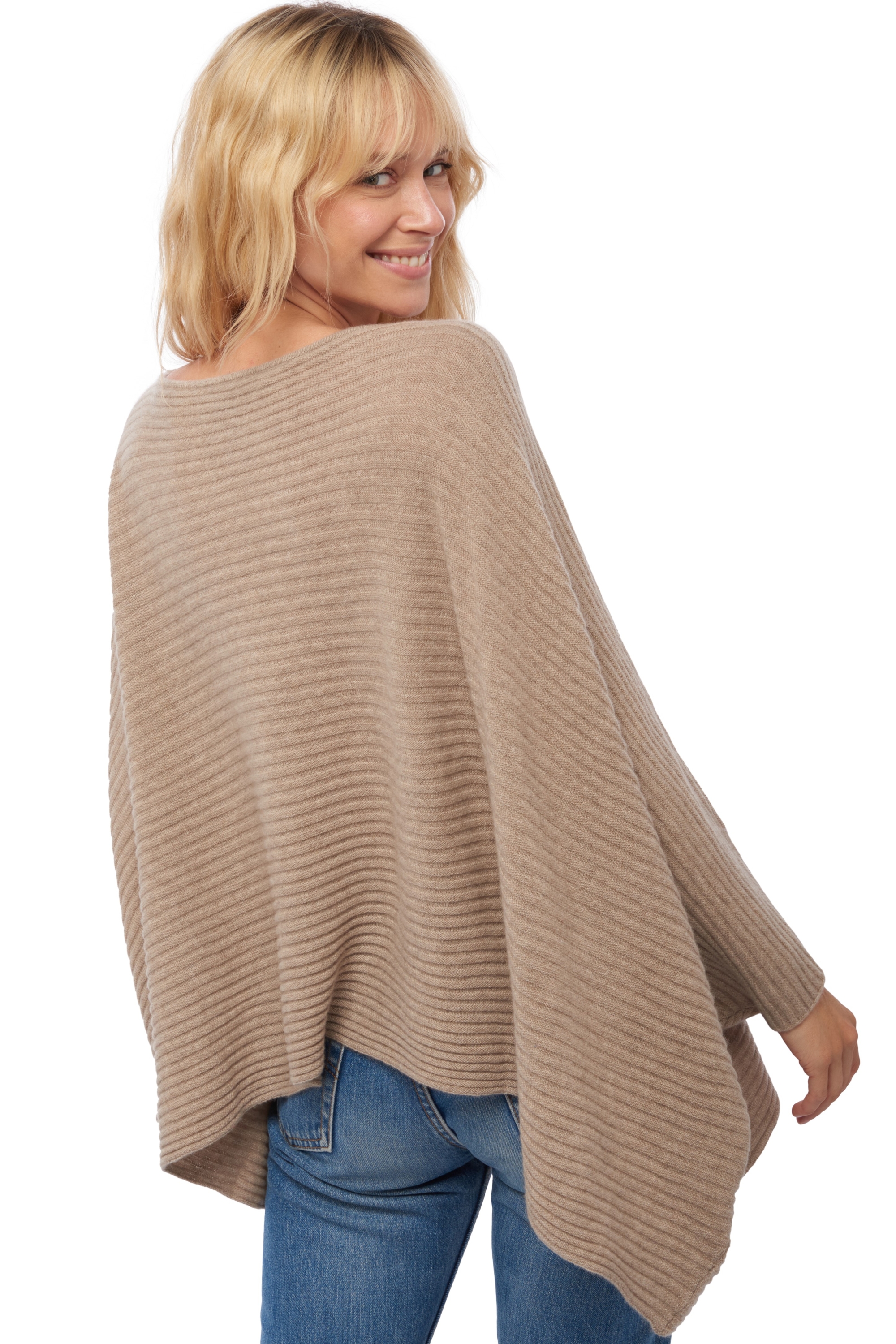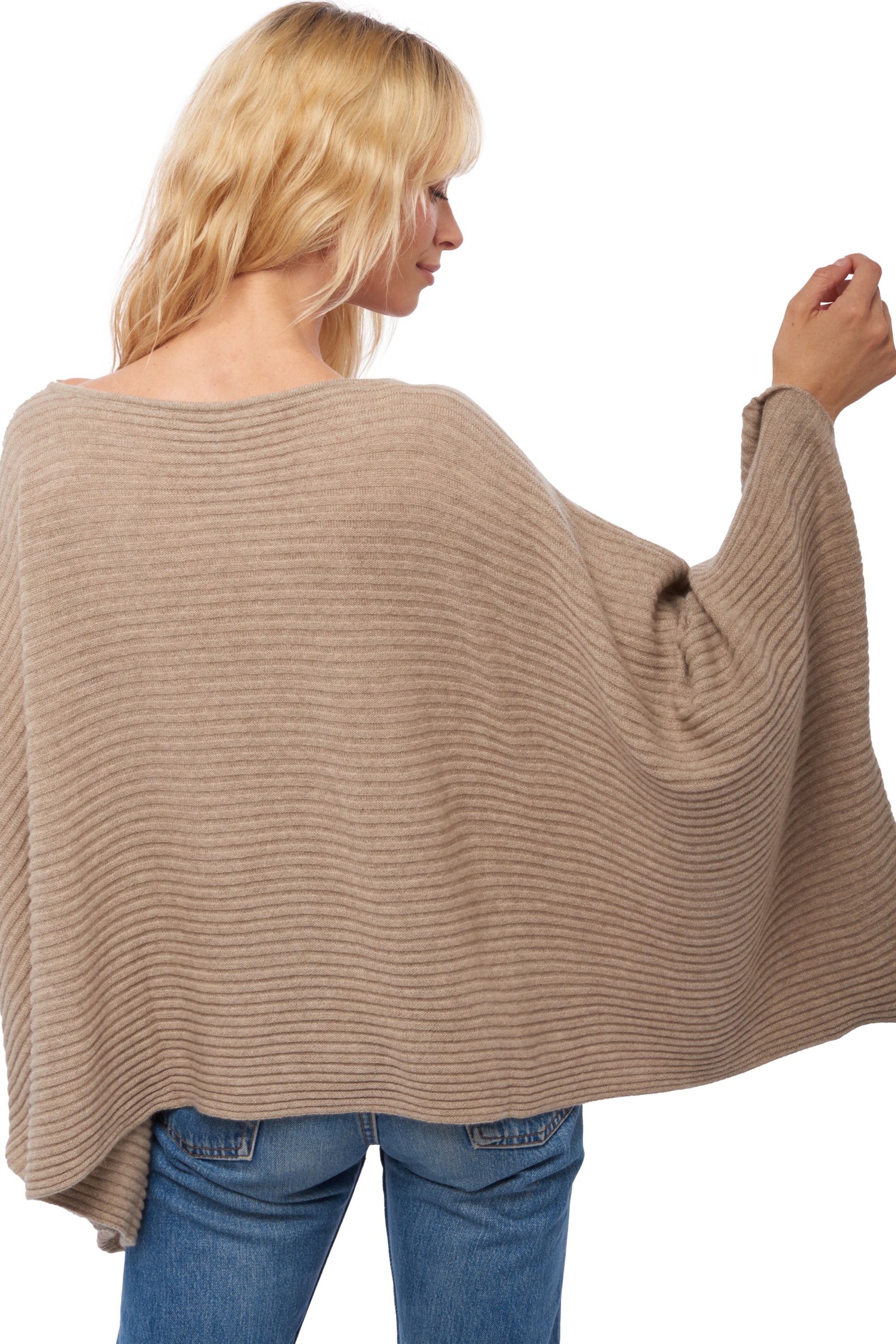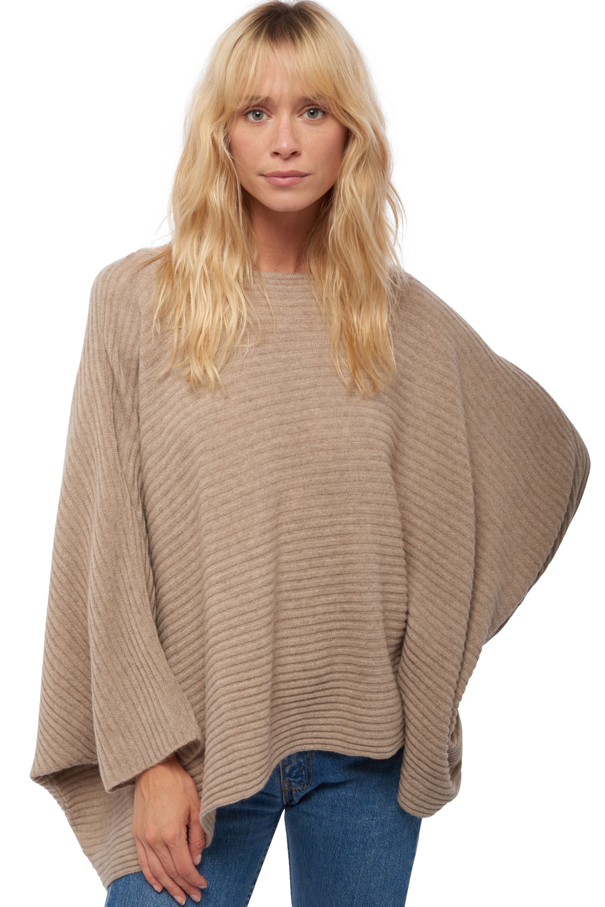 Ribbed poncho sweater with a boat neckline.
